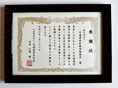 (社)交通遺児育英会様より感謝状をいただきました。