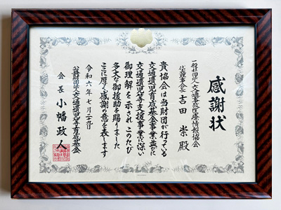この度、長年の貢献が認められ、公益財団法人交通遺児等育成基金様より感謝状をいただきましたのでご報告いたします。