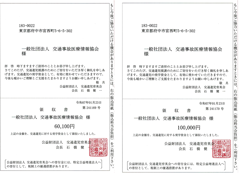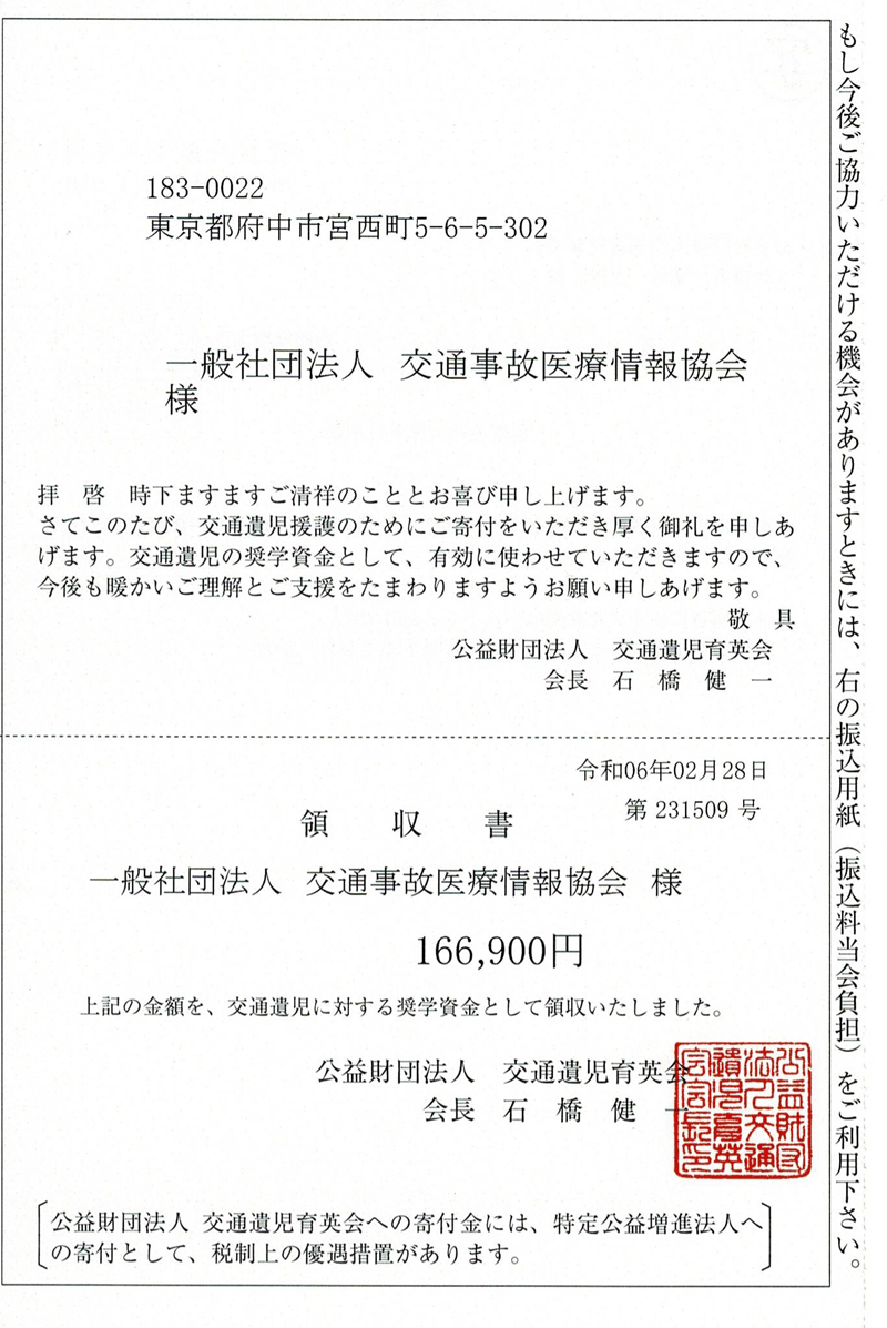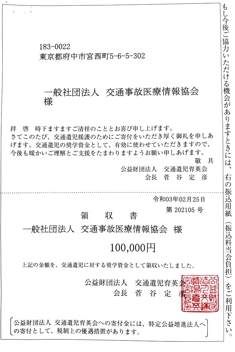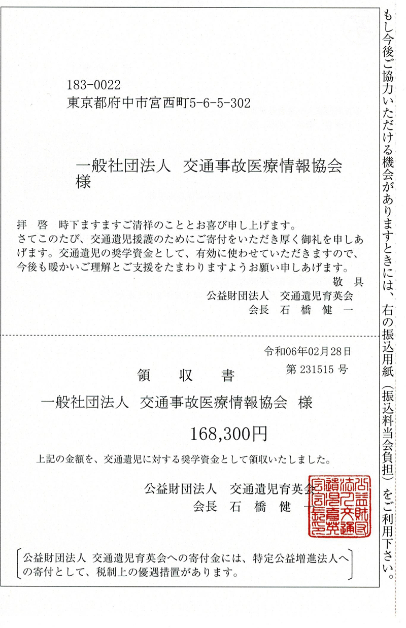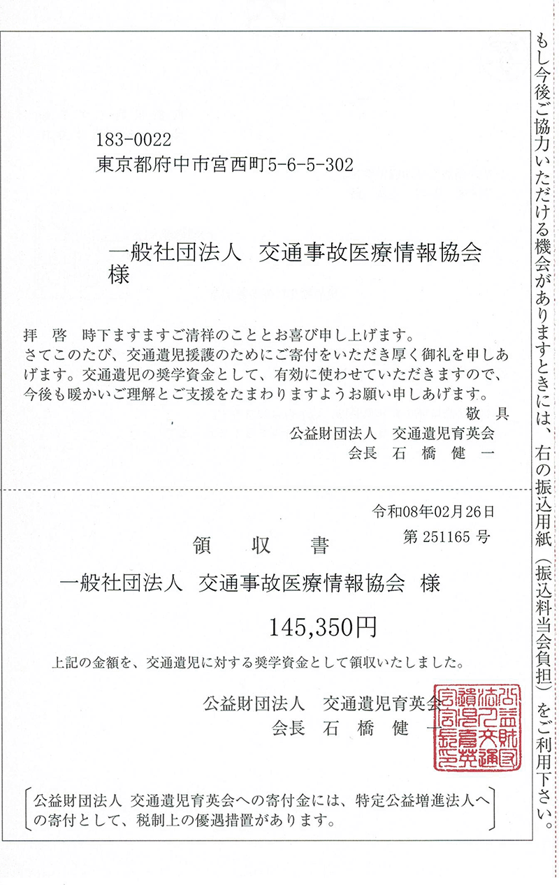 公益財団法人 交通遺児育英会様 寄付金